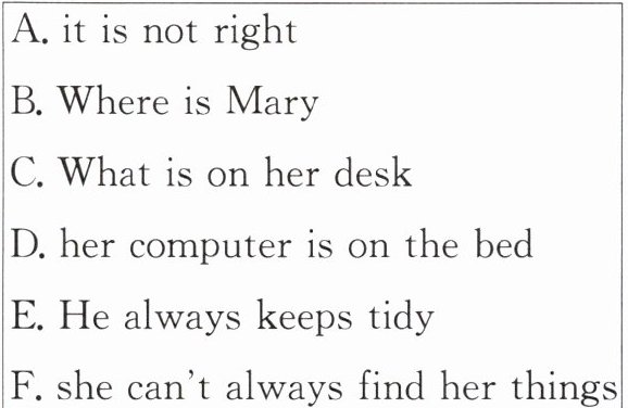 Mary is Mark's little sister. What about her room? Well, 18 . Oh, her schoolbag is on the bed too. 19 ? Her basketball, notebooks and her school things are on her desk. Mary doesn't like cleaning her room, so 20 .