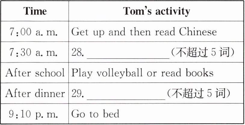 Tom comes from the UK. He studies in a middle school in Tianjin. He usually gets up at 7:00 a.m.and then reads Chinese. He has breakfast at 7:30 a.m. And then he goes to school by bike. He is never late for school. Classes begin at 8:00 a.m. He has four classes in the morning and two in the afternoon.He has lunch at12:30 p.m.at home with his parents.They both work as reporters at a TV station.After school,sometimes he plays volleyball with his classmates,and sometimes he reads books in the school library.He goes back home at 4:40 p.m.He always studies Chinese after dinner.He goes to bed at about9:10 p.m.