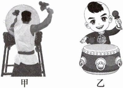 6. 如图所示,甲鼓发声时鼓皮每秒振动的次数比乙的少,甲、乙相比,甲鼓皮(