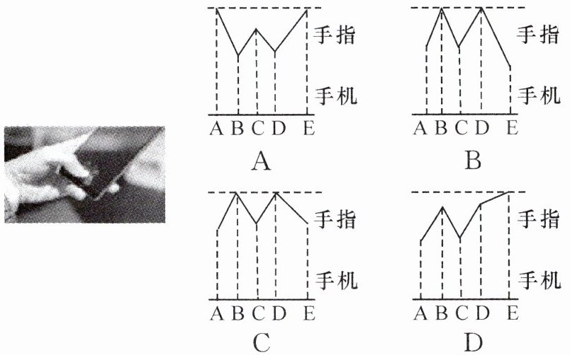 7. 如图,某手机内置有超声波识别系统,手机发出的超声波遇到手指上凸凹不平的指纹 A、B、C、D、E 五个位置,测得回收信号的时间分别为 0.27 ms、0.41 ms、0.27 ms、0.41 ms、0.19 ms,可求出手指与手机平面的距离,则该处指纹的大致形状是 (