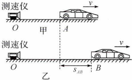 1. 为了监测超速行驶的违法行为,公路上常常设置有超声波测速仪,如图为某公路直线路段的一处测速仪,测速仪能发射和接收超声波。当行驶的小车距离测速仪$ s_{OA}=62\ m $时(如图甲),测速仪向小车发出超声波,超声波“追上”小车时,小车刚好运动到$ B $点(如图乙)。测速仪从发出超声波到接收反射回来的超声波所用的时间为$ 0.4\ s $。超声波的速度为$ 340\ m/s $。求: