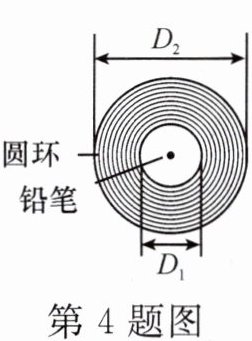 4. 一条纸带厚薄均匀,若把纸带紧密地环绕在圆柱形铅笔上,恰好能套进一个圆环内。如图所示,纸带在铅笔上环绕了n圈,则纸带厚度是