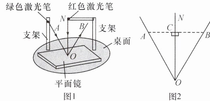 2.为验证光的反射定律,小刚准备了两支不同色光的激光笔、平面镜和固定激光笔的支架,组装为如图1所示实验装置,将该装置放在水平桌面上。打开激光笔后,绿光斜射到平面镜上的O点,红光垂直照射到O点。请回答下列问题: