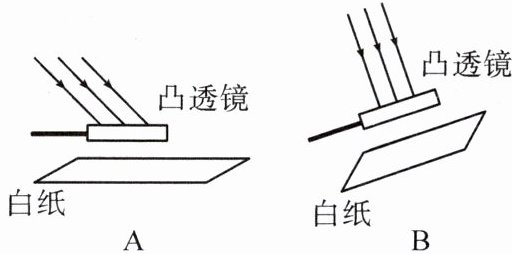 (填“A”或“B”)。来回移动白纸,直到白纸上的光斑变得最小、最亮时,测得该光斑距离凸透镜光心的距离为10 cm,则该凸透镜的焦距为10