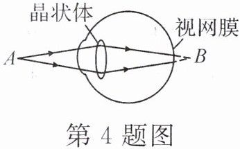4. 如图所示,来自物体上 A 点的光经过眼睛的晶状体成像在视网膜后面的 B 点,要使成在 B 点的像靠近视网膜,物体应该向