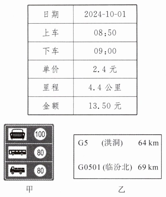 (2)在回程途中经过G5高速公路,某处竖立了两块交通牌,如图甲、乙所示,请根据交通牌的含义计算,在遵守交通规则的前提下,小明所乘的大巴车从交通牌到洪洞最快需要多少小时。