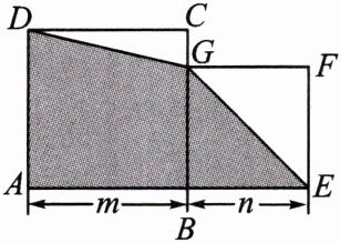 12. 小明将两块边长分别为 $ m $,$ n $ 的正方形地砖按如图方式摆放,$ A $,$ B $,$ E $ 在同一直线上,连接 $ D G $,$ G E $,若 $ m+n= 7 $,$ m n= 12 $,则阴影部分的面积为