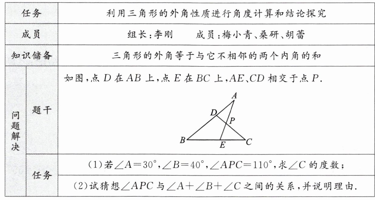 1. 某小组利用延时课进行三角形外角知识的相关研究,制定项目式学习表如下,请你解答任务中的问题: