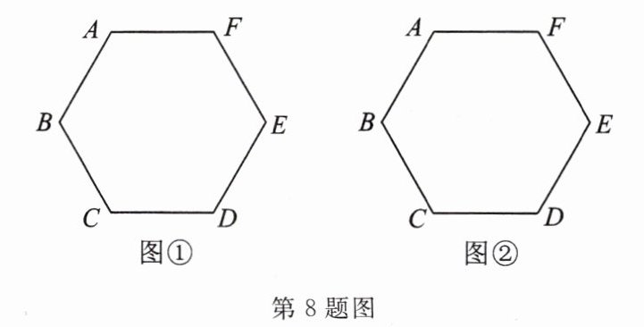 8. (数学与生活)如图,小明家有一个由六根钢管连接而成的钢架 ABCDEF,为了使这个钢架稳固,他计划用三根钢管来连接使它不变形. 你能帮小明设计两种不同的方案吗? (两种方案旋转后不能重合)