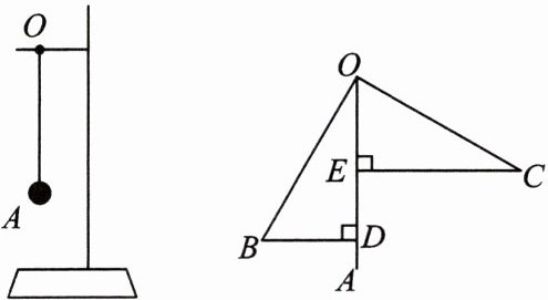 1. 【跨学科】小亮同学在物理课上学习了发声物体的振动实验后, 对其作了进一步的探究: 在一个支架的横杆点 $ O $ 处用一根细绳悬挂一个小球 $ A $, 小球 $ A $ 可以自由摆动, 如图, $ OA $ 表示小球静止时的位置. 当小明用发声物体靠近小球时, 小球从 $ OA $ 摆到 $ OB $ 位置, 此时过点 $ B $ 作 $ BD \perp OA $ 于点 $ D $, 当小球摆到 $ OC $ 位置时, $ OB $ 与 $ OC $ 恰好垂直 (图中的 $ A 、 B 、 O 、 C $ 在同一平面上), 过点 $ C $ 作 $ CE \perp OA $ 于点 $ E $, 测得 $ BD = 7 \mathrm{~cm}, OA = 15 \mathrm{~cm} $.