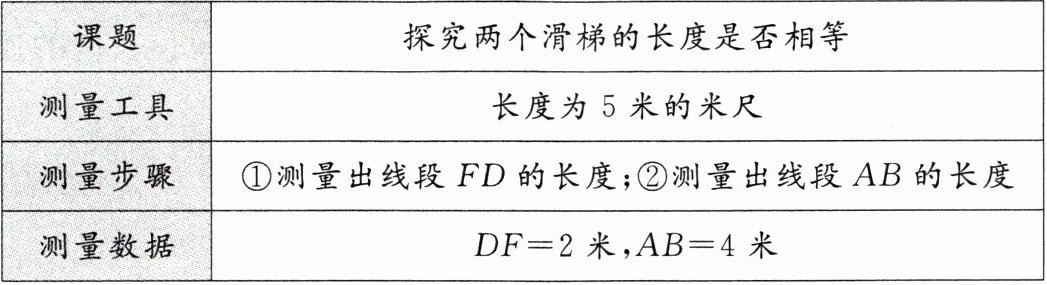 (1) 根据小明的测量方案和数据, 判断两个滑梯 $ BC $ 和 $ EF $ 的长度是否相等? 并说明理由;