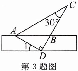 3. 将一个三角板和一块直尺如图摆放,要使$\triangle ABC$是等腰三角形,则$\angle 1$的度数是