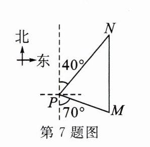 7. (跨学科)如图,一艘海轮位于灯塔$P的南偏东70^{\circ}方向的M$处,它以每小时40海里的速度向正北方向航行,2小时后到达位于灯塔$P的北偏东40^{\circ}的N$处,则$N处与灯塔P$的距离为
