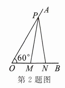 2. 如图,已知 $ \angle AOB = 60^{\circ} $,点 $ P $ 在边 $ OA $ 上,$ OP = 8 $,点 $ M $,$ N $ 在边 $ OB $ 上,$ PM = PN $。若 $ MN = 2 $,则 $ OM $ 的长为 $\underline{