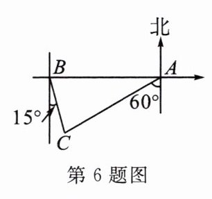 6. 如图,在点$A处有AB$,$AC$两条路,甲、乙两车同时从点$A$出发,甲车沿南偏西$60^{\circ}方向行驶至点C$,乙车沿正西方向行驶至点$B$,经测量,点$C位于点B的南偏东15^{\circ}$方向上,若$AB = 300$米,则点$C到公路AB$的距离为