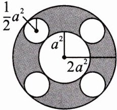 15. 如图是某款智能手机摄像头的几何示意图,可以看作一个内圆半径为$a^{2}$,外圆半径为$2a^{2}$的圆环,圆环上是4个半径为$\frac{1}{2}a^{2}$的圆,则图中阴影部分的面积为
