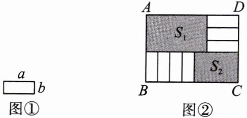 (3)现有$7$张如图①所示的长为$a$,宽为$b$的小长方形纸片,将这$7$张长方形纸片按图②所示放置在大长方形$ABCD$中(纸片间无重叠,无间隙),大长方形中未被纸片覆盖的区域设为$S_{1},S_{2}$,若当$AD$的长度变化时,$S_{1}与S_{2}$的差始终为定值,求$a与b$的数量关系.