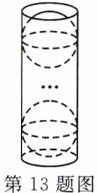 13. (日常生活情境)如图,小明把 $m$ 个大小相同的网球恰好放进新买的圆柱形收纳筒中,则这个圆柱形收纳筒的体积是 $m$ 个网球体积之和的