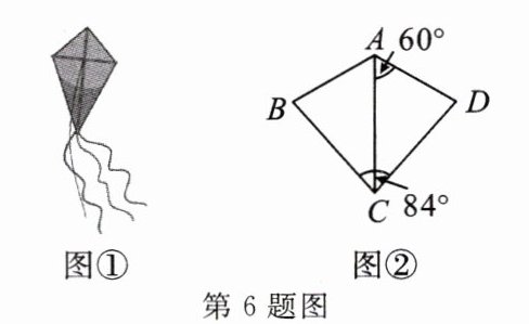 6. 图①是一个左右对称的风筝,图②是其几何示意图,已知$\angle BCD = 84^{\circ}$,$\angle DAC = 60^{\circ}$,则$\angle B$的度数为