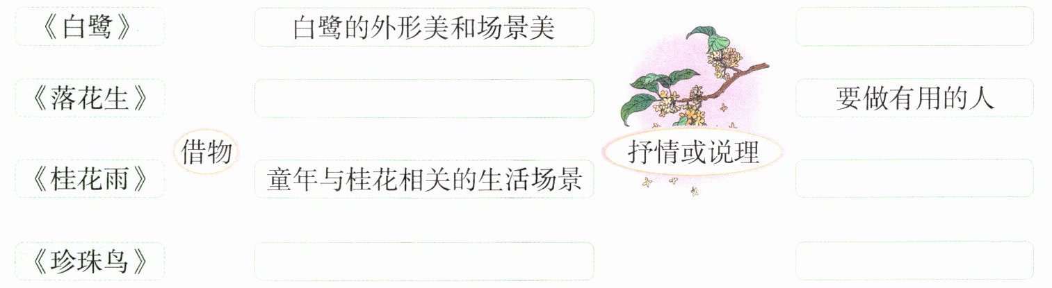左列:花生朴实无华,用处很多 珍珠鸟与“我”逐渐亲近的过程 右列:喜爱和赞美之情 怀念故乡、亲人和童年生活 信赖创造美好的境界