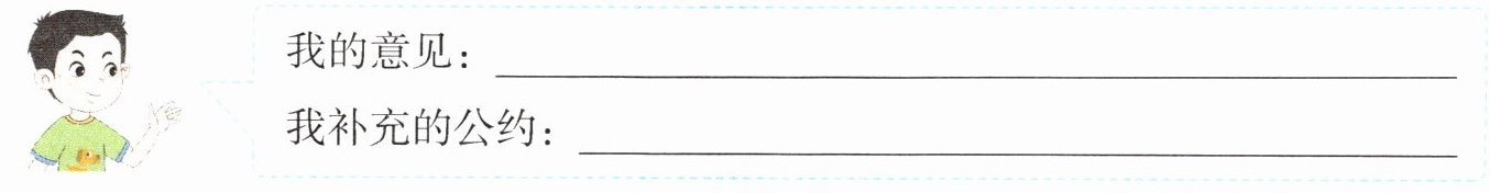 五、【语言实践】同学们拟写了班级公约的草稿,其中有这样两条:一是不准带球类用品进教室,二是同学之间不准随便说话(包括自习课时讨论问题)。对于这两条公约,你有什么意见呢?根据自己的想法,如果要你再补充两条公约,你会补充什么呢?