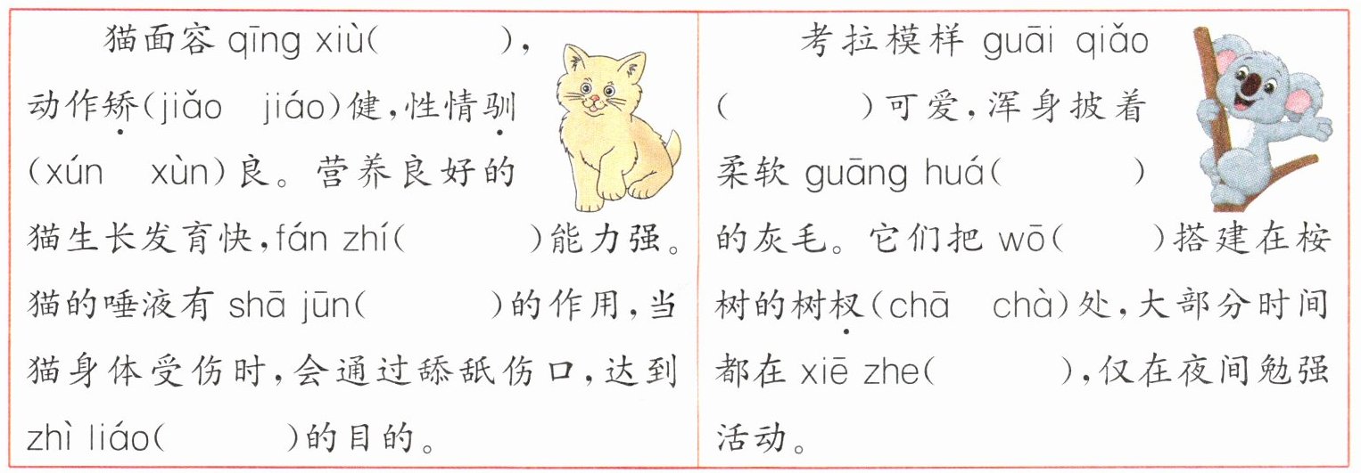 | 猫面容 qīng xiù( ),动作矫(jiǎo jiáo)健,性情驯(xún xùn)良。营养良好的猫生长发育快,fán zhí( )能力强。猫的唾液有 shā jūn( )的作用,当猫身体受伤时,会通过舔舐伤口,达到 zhì liáo( )的目的。 | 考拉模样 guāi qiǎo( )可爱,浑身披着柔软 guāng huá( )的灰毛。它们把 wō( )搭建在桉树的树杈(chā chà)处,大部分时间都在 xiē zhe( ),仅在夜间勉强活动。 |