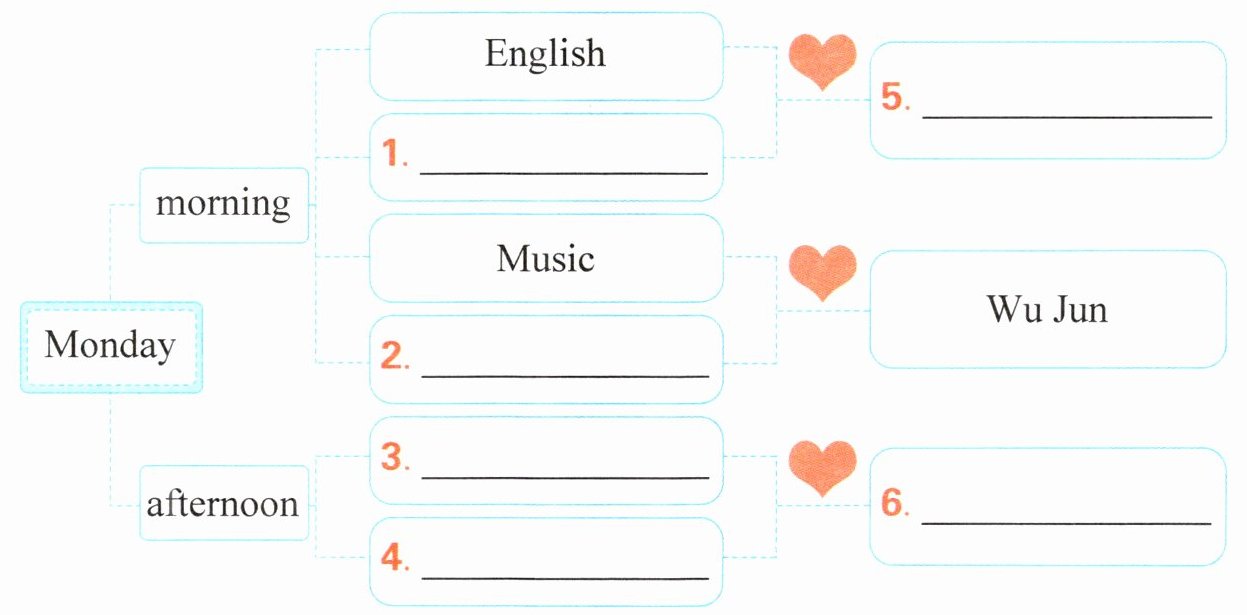 1. Art 2. Maths 3. PE/Chinese 4. Chinese/PE 5. Wang Bing 6. Mike
