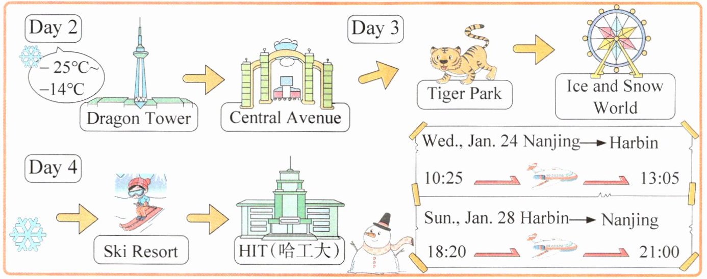 )2. It was cold and snowy in Harbin on the second day.(