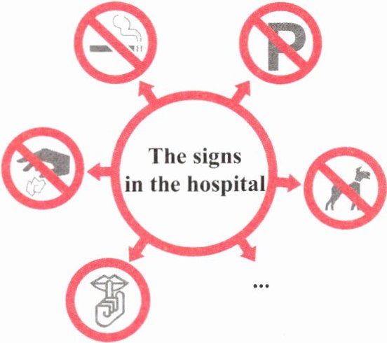 There are a lot of signs in the hospital. Look! The sign near the wall means we shouldn't park our cars or bikes here. Look at that sign on the wall. It means "No smoking". People can't smoke in the hospital. The sign at the front gate means we shouldn't take our pets into the hospital. Look at the sign over there. It means we shouldn't litter anywhere. The sign with a mouth and a finger on it means we shouldn't make noise in the hospital.
