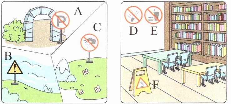 A. No parking. B. Danger! C. No littering. D. No smoking. E. No eating or drinking. F. Wet floor.