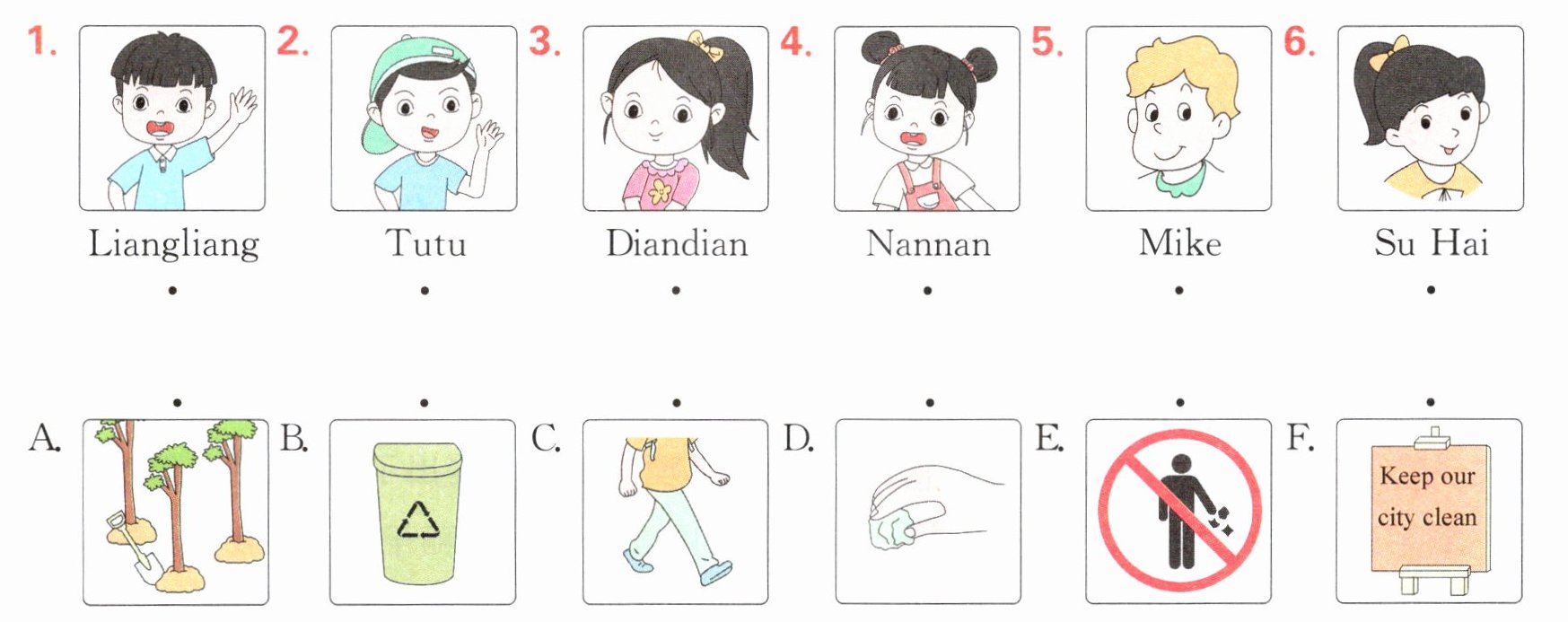 三、亮点原创·听录音,将人物与其所做的环保行为连线。(听两遍)