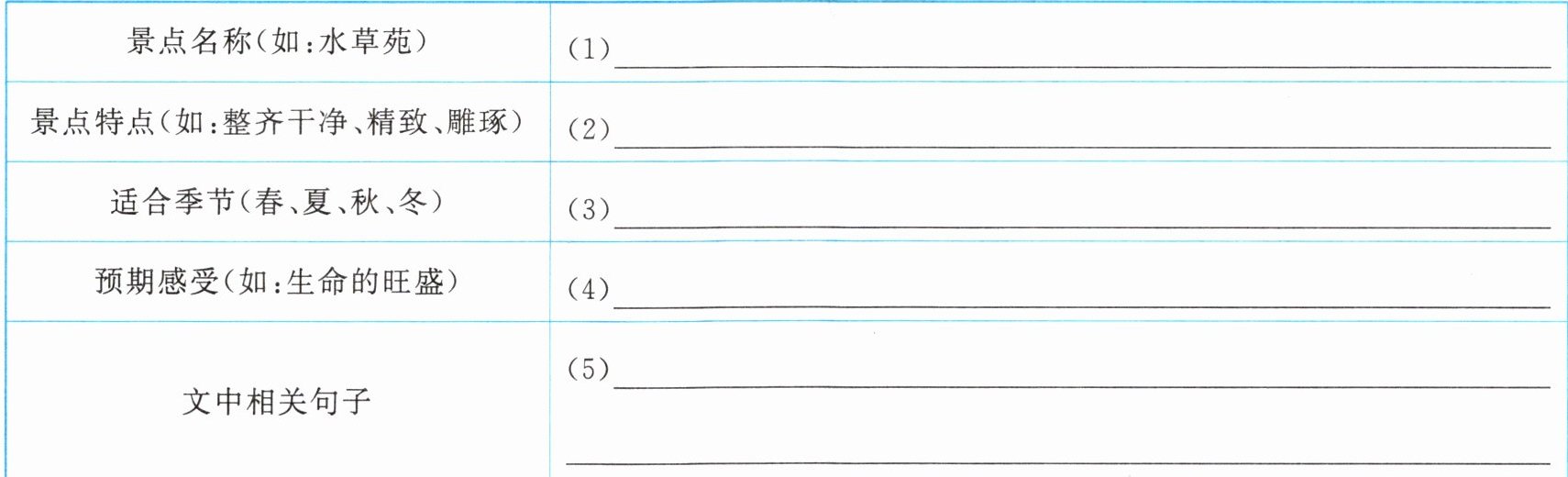 3. 请根据提示,结合文章内容,为同学们推荐一处阿勒泰的美景,完成表格。(5分)