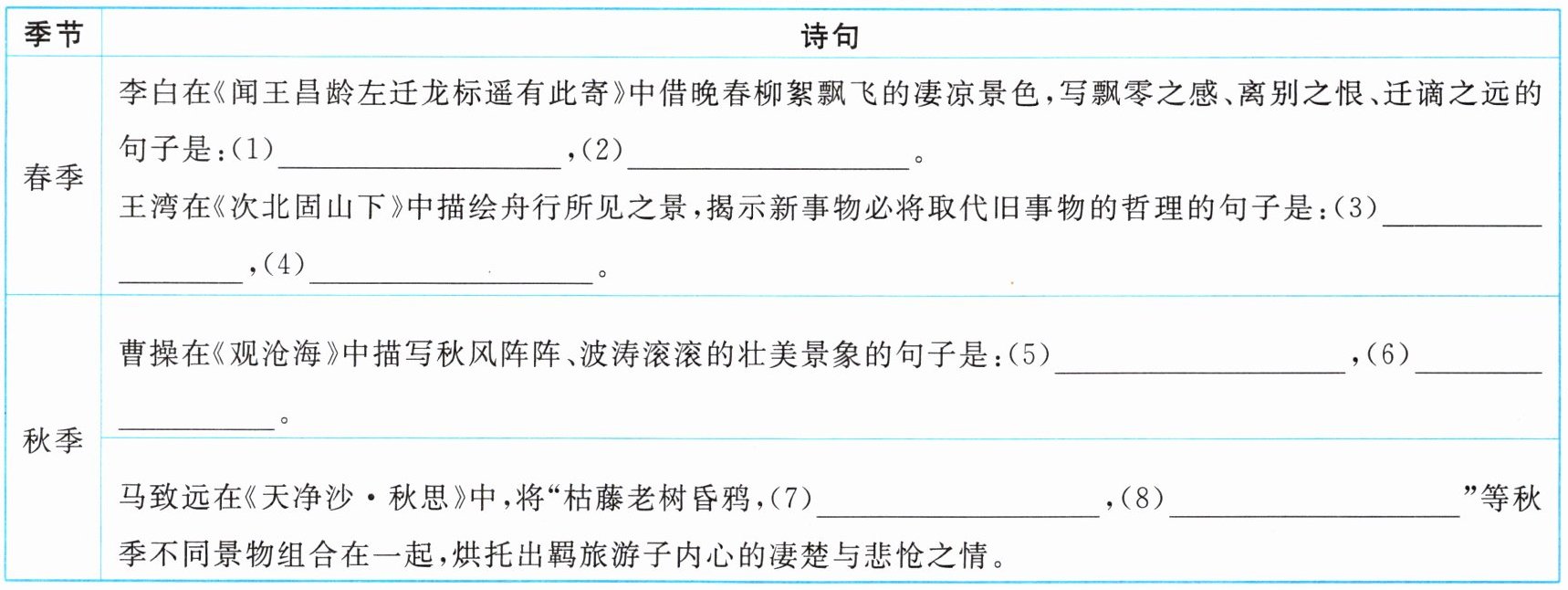 1.在诗人眼里,四季皆有诗情。小语总结了下面的表格,请你补充完整。(8分)