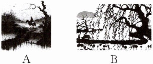 2.小语给《天净沙·秋思》画了两幅插图,请你选择最适合的一幅,并谈谈你选择这幅插图的理由。(可从画面中的景物、画面营造的氛围两个角度回答)(4分)