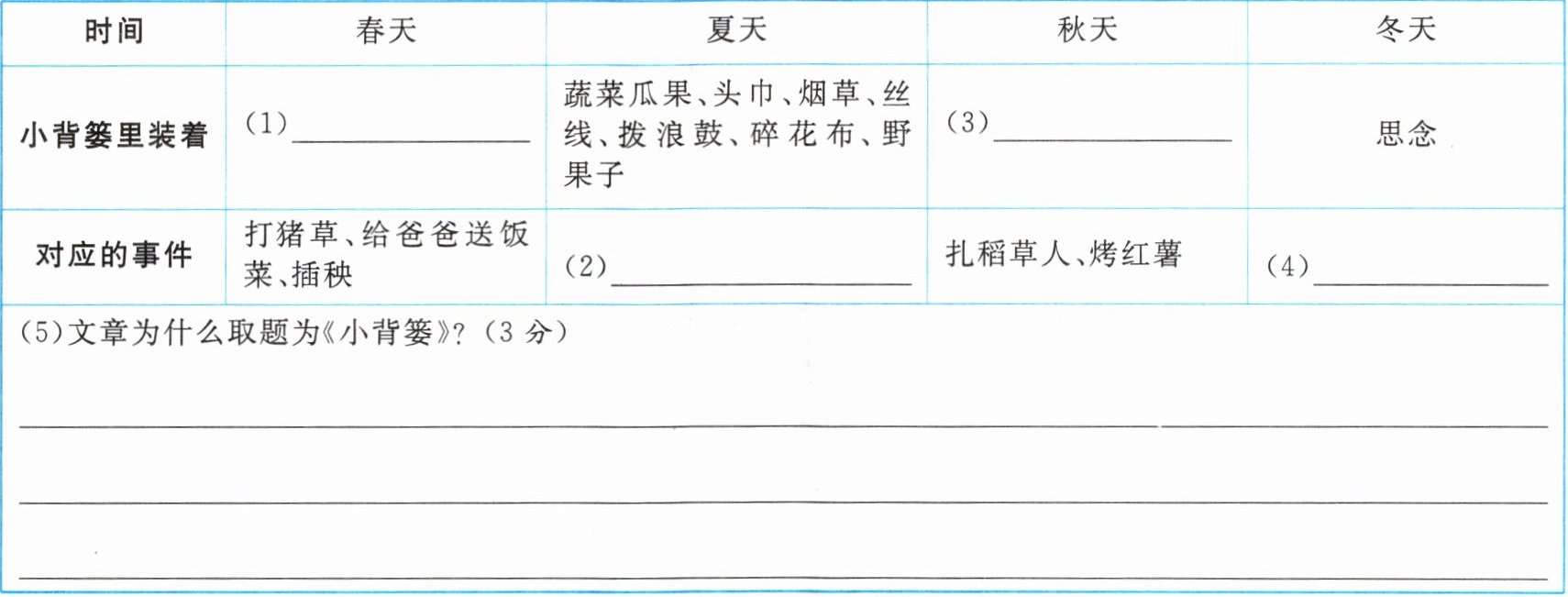 3. 请你和同学们一起梳理与小背篓相关的物和事,然后探究文章为什么取题为《小背篓》。(7分)
