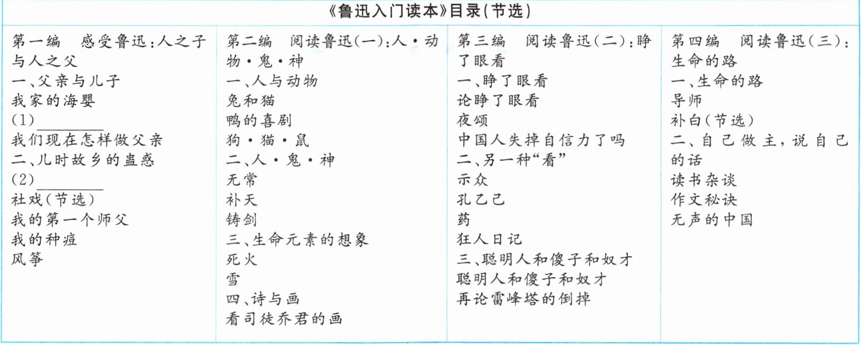 8. 《鲁迅入门读本》的目的在于引领青年走进鲁迅的精神世界。请阅读部分目录,根据这本书的编排方式和选篇内容,探究编者是怎样达成这一目标的。(4分)