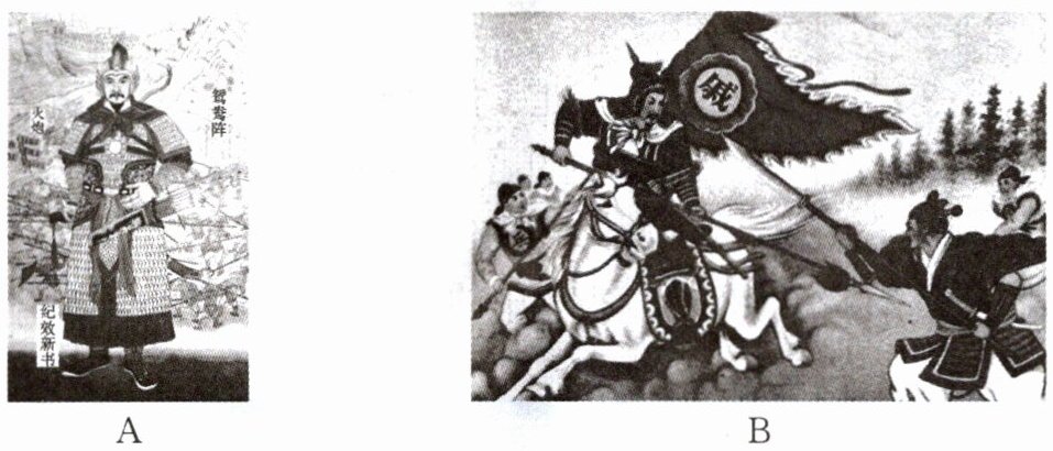 @@6.(4分)示例一:A图中是一个身穿铠甲、佩戴弓箭的武将,背景有厮杀的士兵、一艘船和“纪效新书”“鸳鸯阵”等字样,给我们展现了一个富有领导力和军事谋略的将领形象。文中介绍戚继光招募三千人,训练有加,又根据地形编制阵法,使戚家军闻名天下,可见他善于军事谋略,是一个卓越的军事领袖;戚继光还写了《纪效新书》,表现出他的军事智慧。示例二:B图片刻画了一个在疾驰的马上用长矛击刺敌人的将领形象。文中介绍戚继光招募三千人,教他们击刺之术,又根据地形编制阵法,使戚家军闻名天下,可见他是一个卓越的将领;文中写戚继光果敢刚毅,做事如暴风闪电般迅猛,骑马击杀敌人正好表现了这一点。