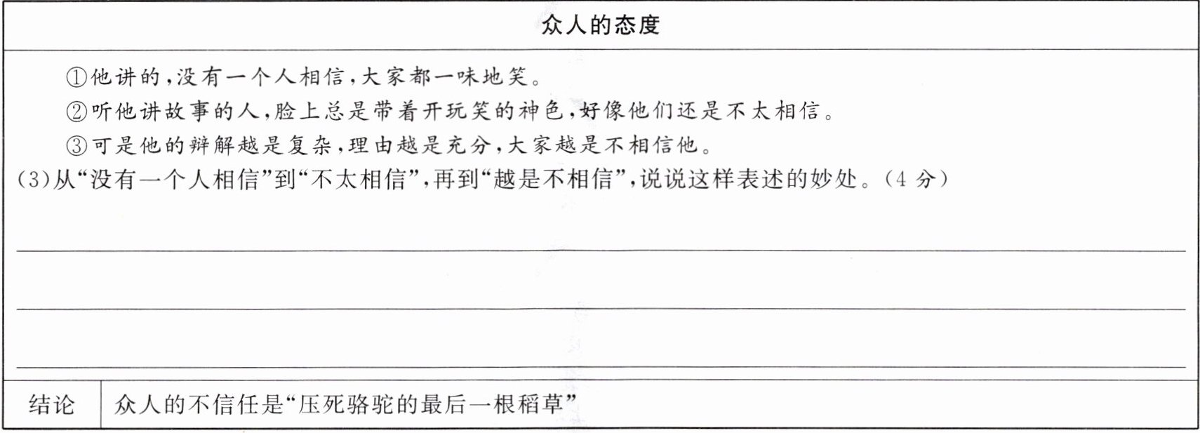 (3)(4分)从“没有一个人相信”到“不太相信”,再到“越是不相信”,可见众人不信任奥什科纳的程度在加深,为结尾奥什科纳含冤而死做铺垫。一再的不信任,一方面表现出众人的冷漠、缺乏同情心,另一方面也讽刺了众人的愚昧与偏见,引发读者深思。
