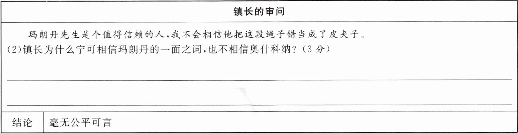 (2)(3分)示例:作为统治阶层一员的镇长,他不信任奥什科纳是因为他对贫苦人存在偏见,相信马具商玛朗丹是因为他与商人有着共同的阶级观念,体现出他对马具商玛朗丹的包庇。