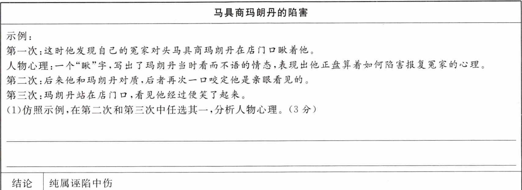 (1)(3分)示例一:第二次:一个“咬”字,写出了马具商玛朗丹为了陷害奥什科纳肆无忌惮地做伪证的狡诈心理。