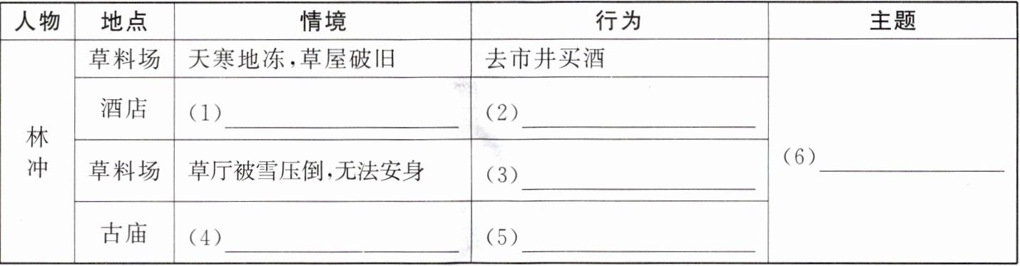 (4)(1分)制造悬念与神秘感 4.(4分)①推动了故事情节的发展,林冲因下雪去买酒而幸免于难,也因大雪压倒草厅而投宿古庙,得以听见陆虞候等人的奸计;②渲染了林冲杀敌报仇的悲壮氛围;③“风雪”是林冲活动的环境,有利于刻画林冲决定反抗前委曲求全的形象;④暗示林冲的悲惨命运,为林冲投奔梁山做铺垫。 5.(5分)示例:我觉得把林冲逼上梁山的是高俅。林冲原为东京八十万禁军教头,武艺高强。高俅为了帮助义子高衙内抢走林冲的妻子,设计陷害林冲,使他误入白虎堂,蒙冤刺配沧州;不仅如此,高俅还吩咐两个差拨在押解路上对他百般折磨,差点杀死林冲;在林冲被发配到草料场后,他又指使陆虞候等人去杀害林冲。最后,林冲终于奋起反抗,在忍无可忍的情况下杀死了陆虞候等人,冒着风雪奔上梁山。