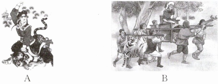 示例二:B 这幅插图在构图上以细节的刻画、完整饱满的布局,赋予人物形象特殊意义。图中猎户们扛着被武松打死的猛虎,兴高采烈地走下山,武松坐在滑竿上被猎户们抬着,衬托出武松高大的形象,体现出百姓对勇士和力量的崇拜。