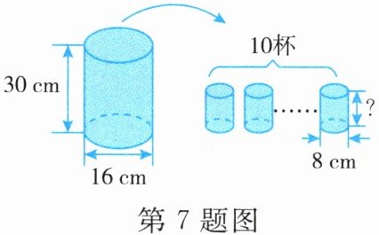 7. 如图,现有底面直径为 16 cm、高为 30 cm 的圆柱形容器,里面装满了果汁,小亮要把果汁分装到底面直径为 8 cm 的 10 个小圆柱形杯子里(每个杯子刚好装满),请你帮他计算杯子的高度。