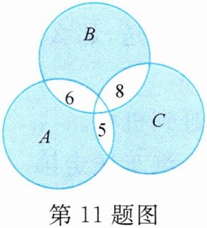 11. 如图,每个圆形纸片的面积均为30,圆形纸片A与B,B与C,C与A的重叠面积分别为6,8,5,三个圆形纸片覆盖的总面积为73,则图中阴影部分的面积为(
