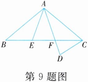 9. 如图,在△ABC中,AB=AC,点E,F在边BC上,BE=CF,点D在AF的延长线上,AD=AC。若∠BAE=30°,求∠ADC的度数。