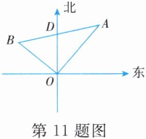 11. 一艘轮船以16海里/时的速度离开港口O(如图),向北偏东$40^{\circ }$方向航行,另一艘轮船同时以12海里/时的速度向北偏西的某个方向航行。已知它们离开港口1.5h后相距30海里(即$AB=30$海里),问另一艘轮船航行的方向是北偏西多少度?