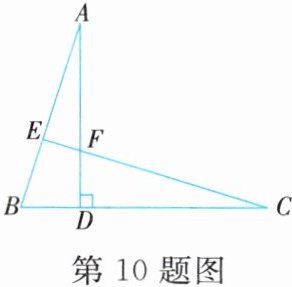 10. 如图,已知$\triangle ABD\cong \triangle CFD$,$AD\perp BC$于点 D,延长 CF 交 AB 于点 E。