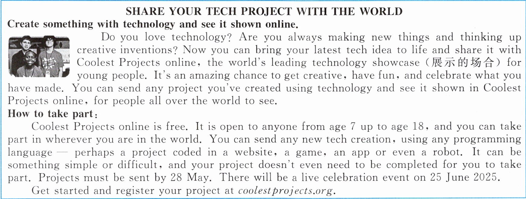 )2. To take part in Coolest Projects online,you _______.A. have to be over eighteen years old