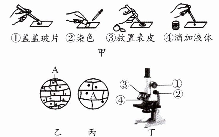 5.洋葱被称为“蔬菜皇后”,其营养成分丰富,对癌症、心血管等疾病都有预防作用。图甲是小科利用洋葱鳞片叶内表皮制作临时装片的过程示意图,图乙是显微镜下观察到的洋葱鳞片叶内表皮细胞结构图。以下说法正确的是 ( )
