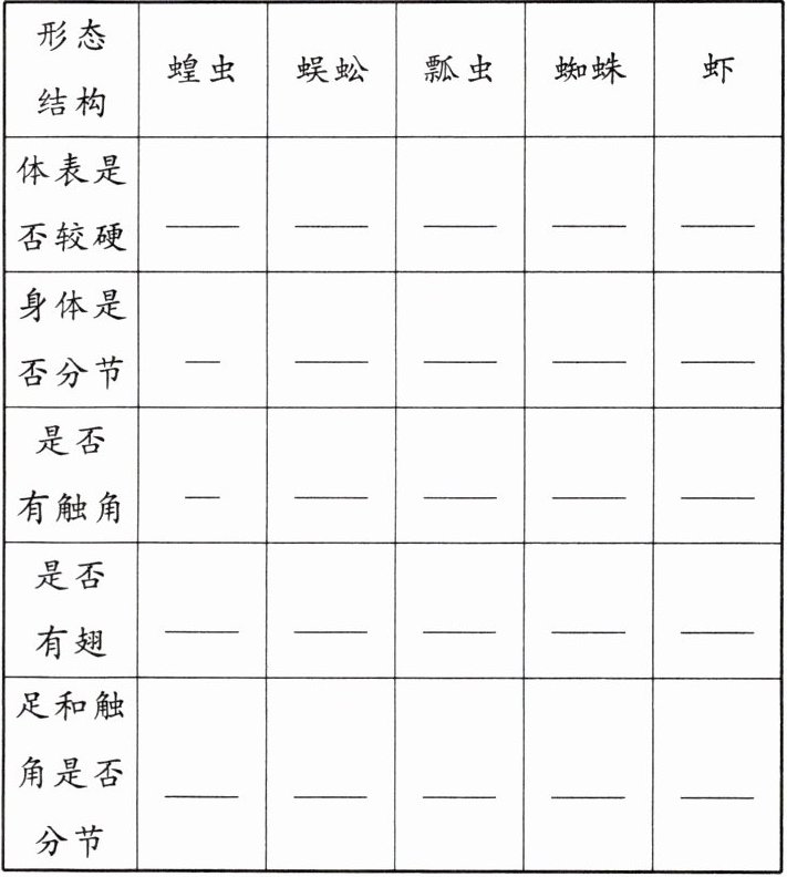 (2)答:表格中所有动物的共同特征:体表较硬,身体分节,具有分节的足和触角,即体表有坚硬的外骨骼,身体和附肢都分节。节肢动物的身体和附肢分节,可使动物的运动更加灵活,提高了节肢动物的运动能力,外骨骼还可以保护和支持内部柔软器官、防止水分蒸发。